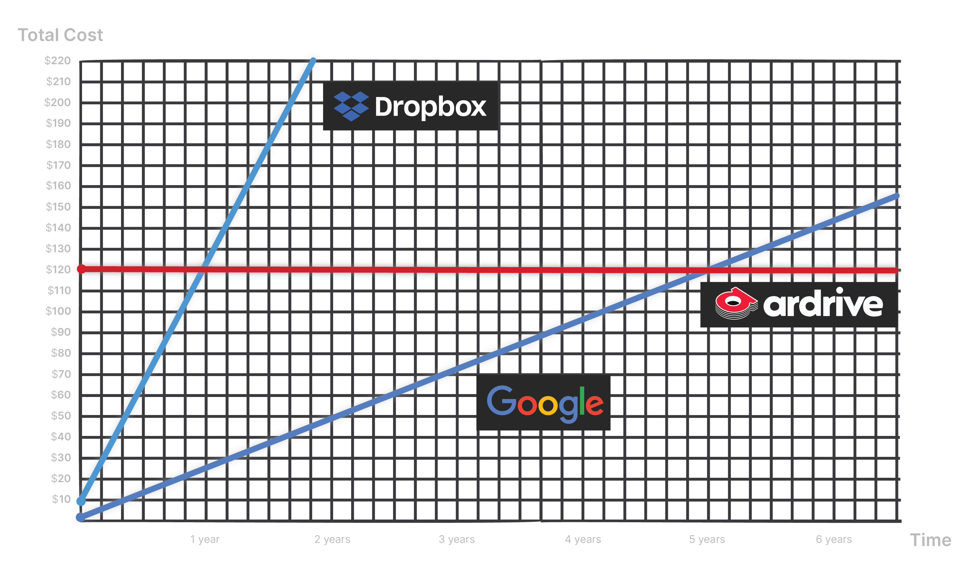 If you look at more consumer-type products such as Dropbox or Google Drive the price will rise significantly. The prices for these products are always based on the ubiquitious subscription model and the storage will stop when you stop paying, and could be lost (it happens), unlike the one-time forever and permanent model of Arweave.
